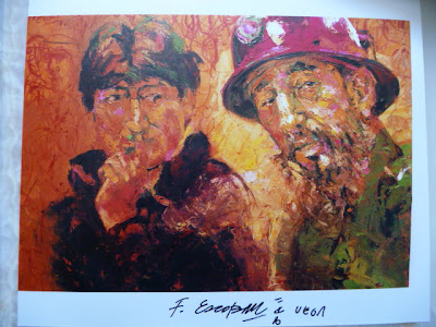Numa esquina da Praça 14 de Setembro, no Salón Gildaro Antezana uma exposição com quadros do pintor Fredy Escobar Vega. Gostámos do estilo, muito especial, retratos a óleo e acrílico sobre tela, mas à maneira de desenho, com riscos coloridos, sobrepostos, a finalizar. Reproduzimos aqui um deles, o retrato de Evo Morales com Fidel de Castro. Fica também o endereço email do autor (ferediescobar@gmail.com).