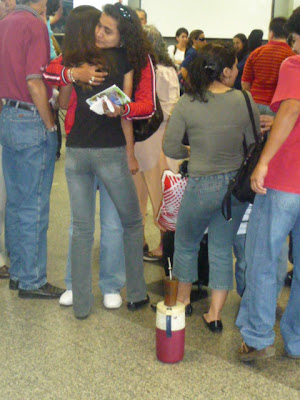 A equipa feminina Paraguaia de futebol de salão viajou connosco até S. Cruz, em transito para Madrid... com uma grande claque à despedida no aeroporto. No chão o tal recipiente para teréré que muitos Paraguayos carregam para ir bebendo.