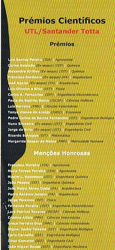 This message is a private property and may contain confidential information intended solely for the addressees. If you are not the intended recipient of this message please delete this message from your system.Any unauthorized use, disclosure or copy not expressly authorized is strictly prohibited. This work reflects an opinion and any similitude with alive persons or institutions is a mere coincidence. Ainda o prémio de investigação UTL/ Santander Totta que ganhámos em 2010
